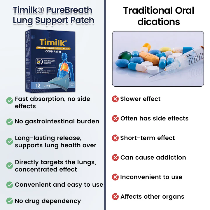 The Timilk® PureBreath Lung Support Patch utilizes innovative natural therapy, with a focus on powerful ingredients like nano-quercetin and resveratrol. When applied, the patch’s advanced transdermal technology allows the active ingredients to penetrate deeply, providing immediate relief. It enhances blood circulation in the lungs, clears mucus and toxins, and helps open the airways, effectively supporting lung health and improving overall respiratory function.