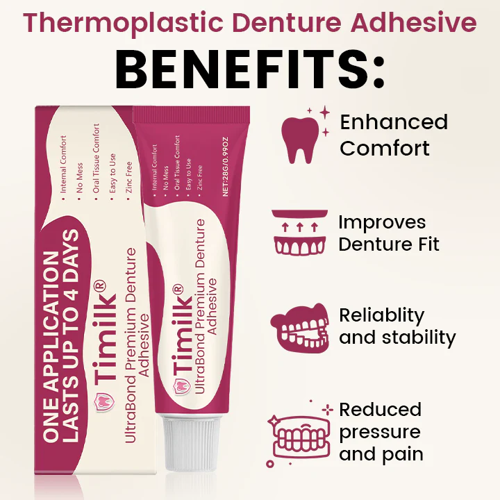 Experience a new standard of denture comfort and confidence with Timilk® UltraBond Premium Denture Adhesive. Powered by advanced ThermoBond heat-activated technology, it forms a personalized, secure seal that adapts perfectly to your gums — providing up to 4 days of slip-free hold. Enjoy every meal, every conversation, and every smile knowing your dentures stay perfectly in place — comfortably and naturally.