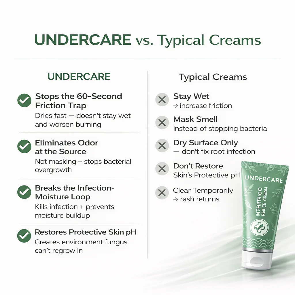 Penetrates deep into the groin fold, kills fungus and bacteria at the cellular level, then dries into a protective powder-finish barrier – providing fast and visible results (unlike traditional antifungal creams that stay wet and create the perfect breeding ground for more fungus).