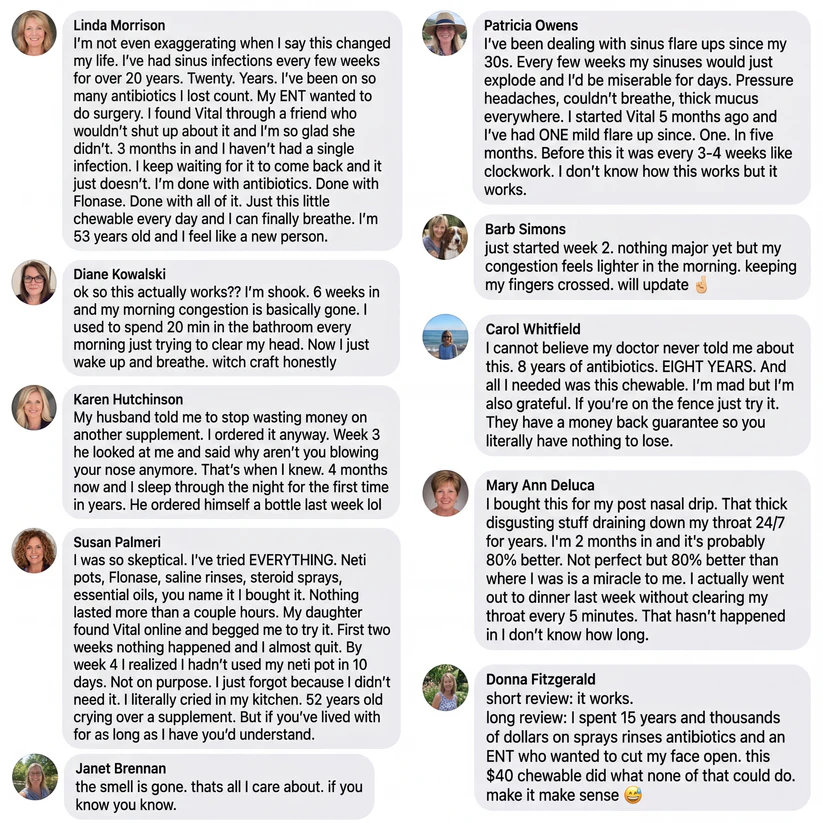 Those treatments target the sinuses, but the bacteria keep coming back because nothing ever addressed the source. Antibiotics actually make it worse by wiping out the good bacteria that were protecting you. Vital works upstream by rebalancing your oral microbiome so the bad bacteria stop being resupplied into your sinuses in the first place.