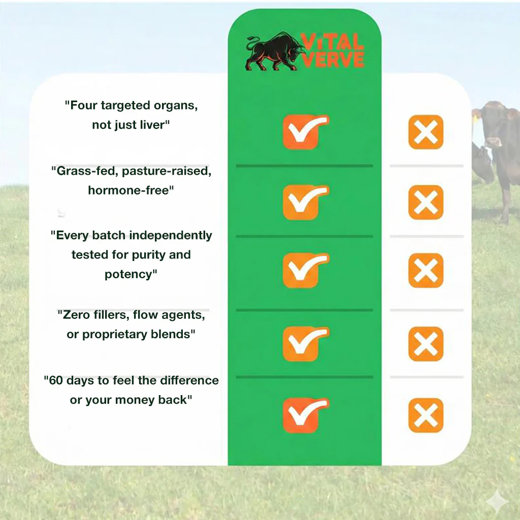 Unlike many ordinary testosterone support supplements on the market, Vital Verve doesn’t rely on synthetic stimulants or artificial boosters. Where most standard formulas fall short, this formula draws on ancestral principles — whole-food organ complexes sourced from grass-fed beef, delivered in their most bioavailable form.