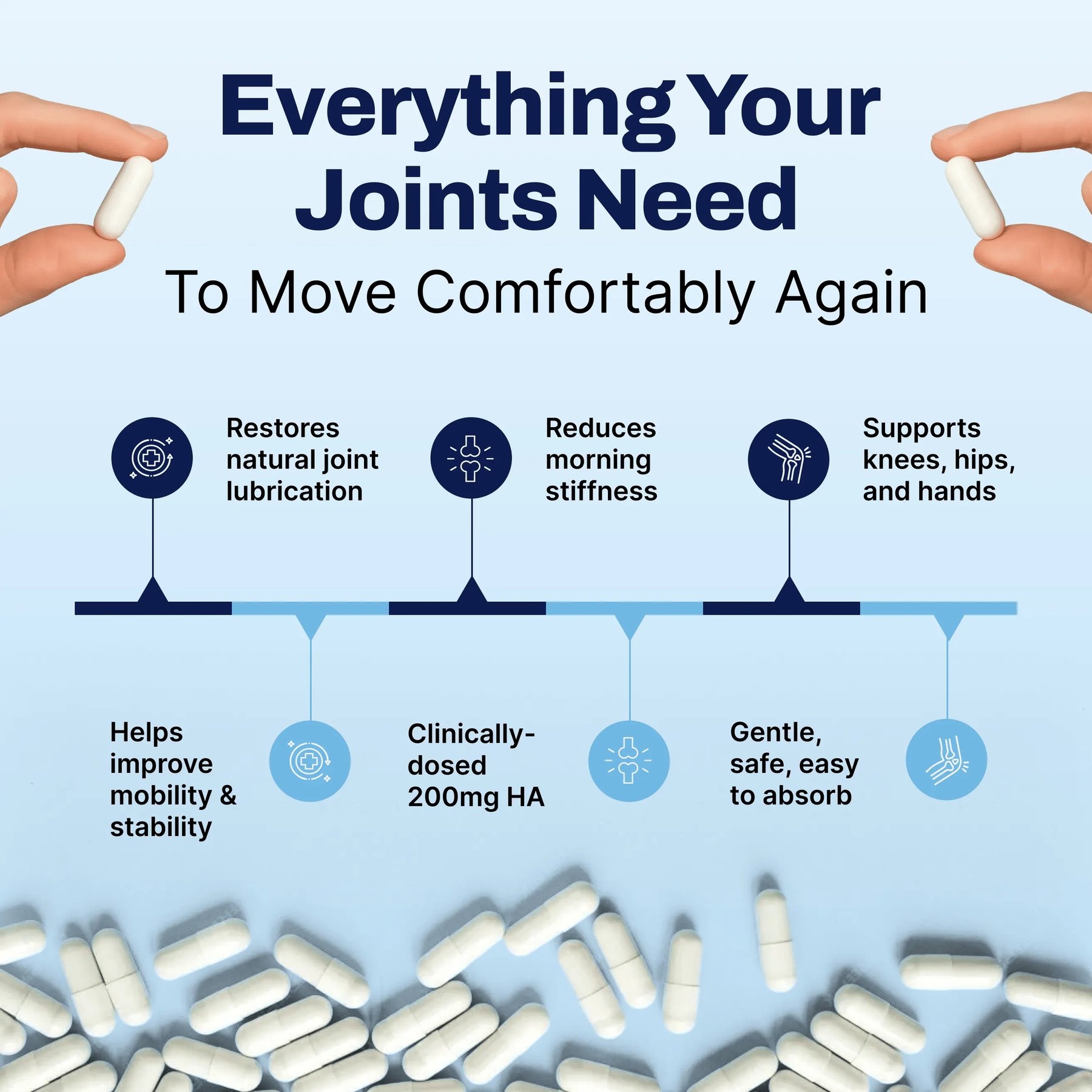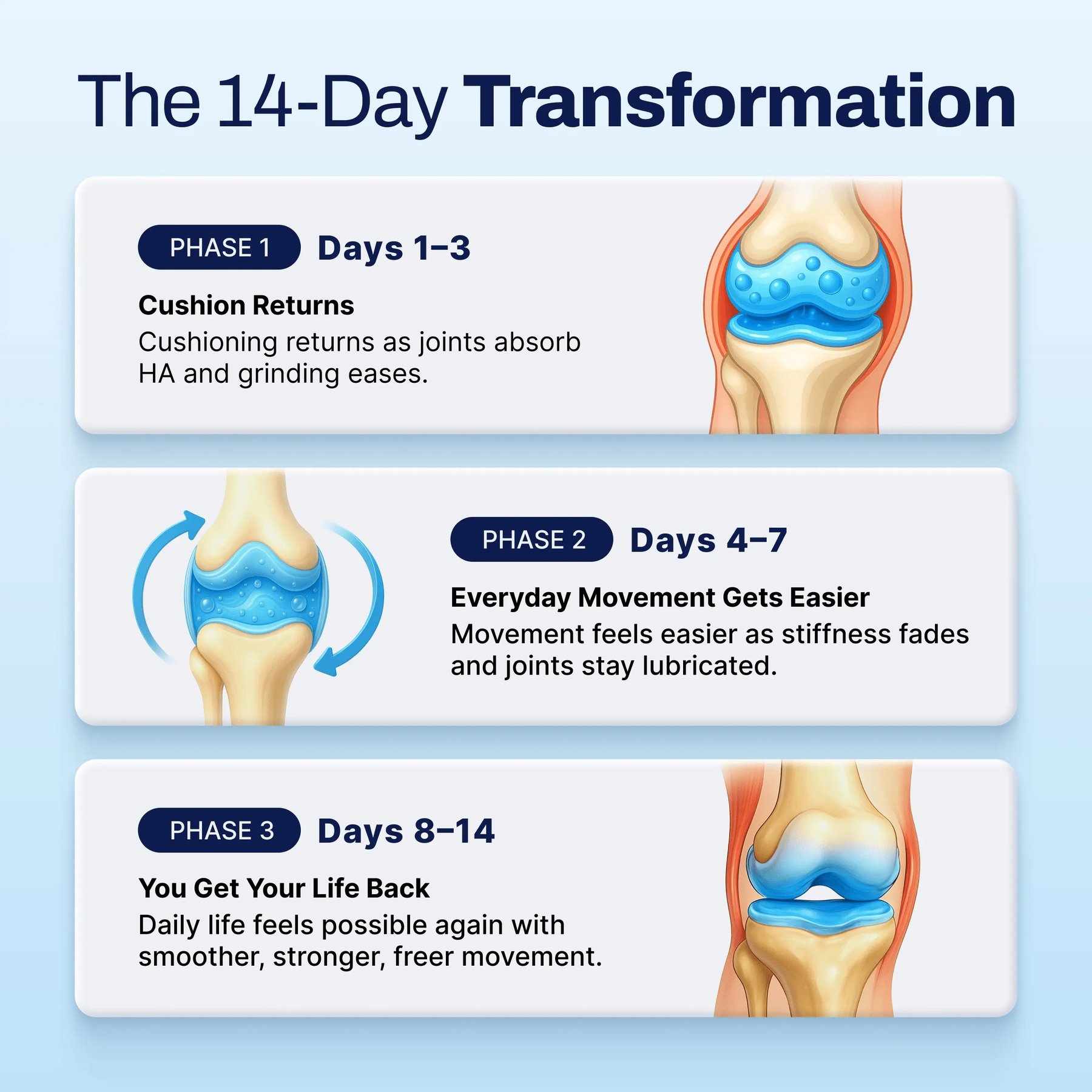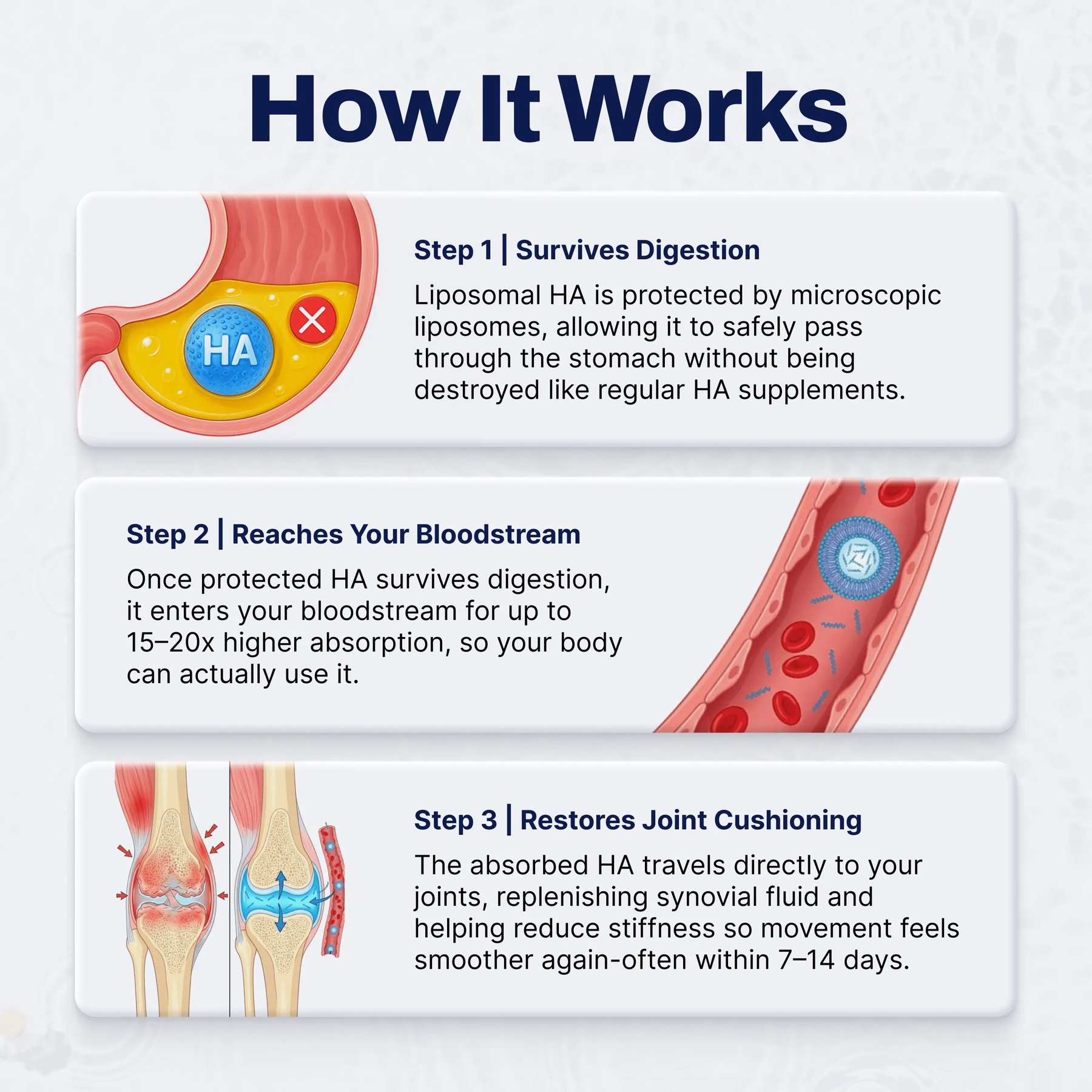 No new exercises. No diet overhaul. No doctor visits. Just 2 capsules with your morning coffee — and let the HA go to work rebuilding the cushion your joints have been starving for. Here’s how it works: