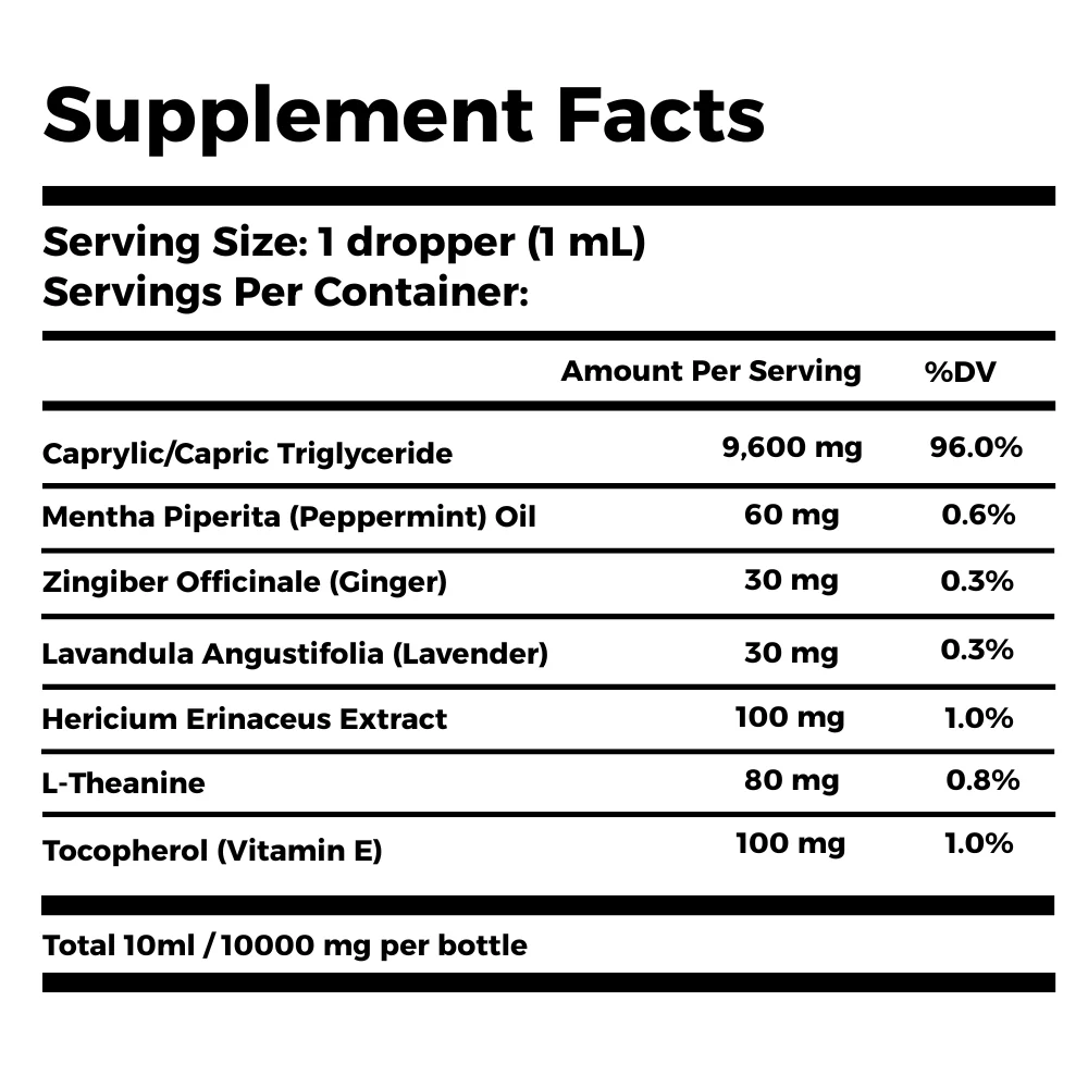 Caprylic/Capric Triglyceride — derived from fractionated coconut oil — acts as the delivery vehicle, carrying the active botanicals through the skin quickly and efficiently. L-Theanine supports a calm, focused mental state without sedation. Lion’s Mane Extract supports nerve health over longer-term consistent use. Vitamin E provides antioxidant protection and helps maintain skin comfort at the application site.
