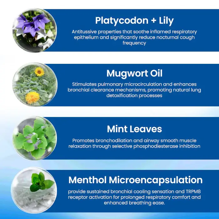 Time-released menthol microcapsules provide sustained bronchial cooling sensation and TRPM8 receptor activation for prolonged respiratory comfort and enhanced breathing ease.